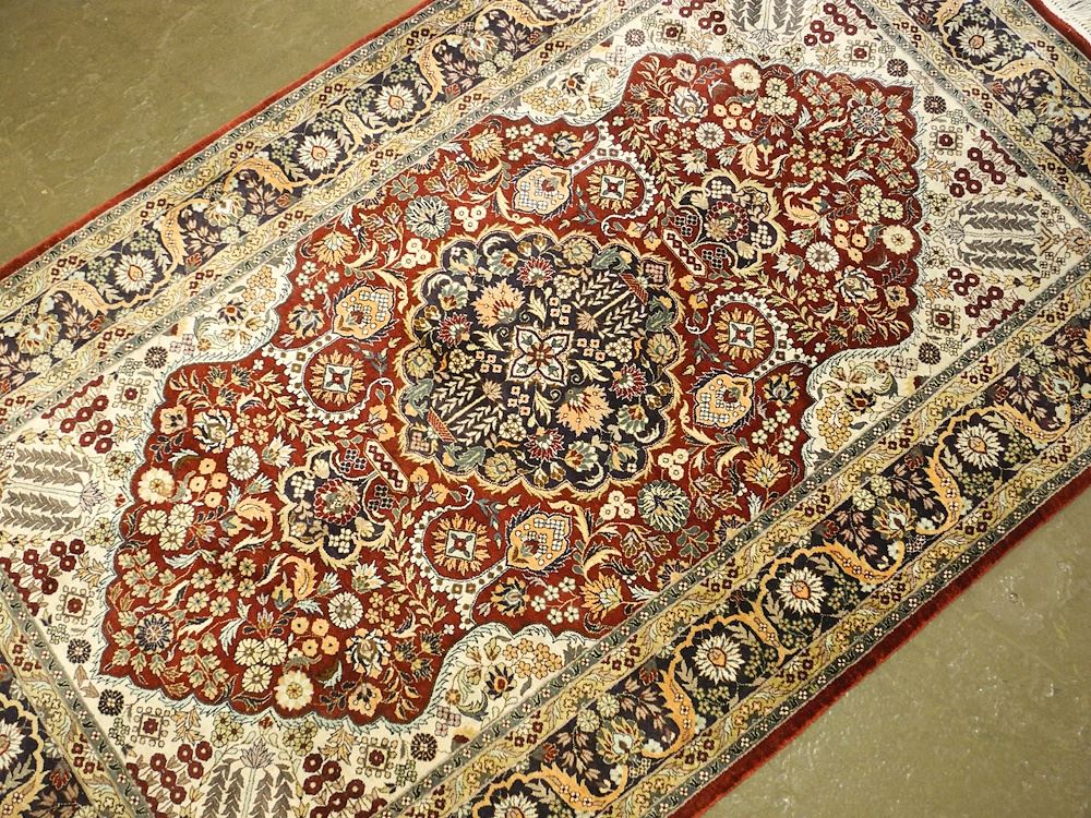 LOT 37 Silk Qum Runner, Approximately 5'9" x 3'11". Estimate: $700 - $900 Sold For: $900 Auction Date: Tuesday, December 12 2023 at 4:00 PM