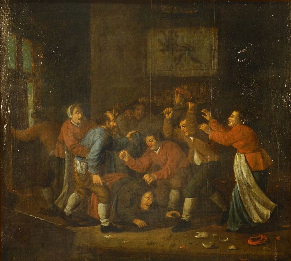 Unsigned Oil on Board, 14 1/2 x 16", "Tavern Brawl".