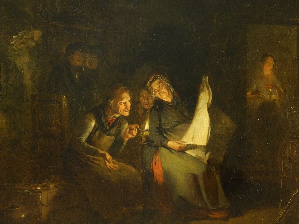 LOT 164 Unsigned 19th C. Oil on Canvas, 20 x 24", "News by Candlelight". (restoration noted). Estimate: $200 - $400 Sold For: $250 Auction Date: Tuesday, December 12 2023 at 4:00 PM