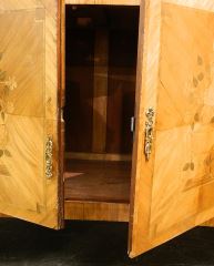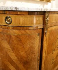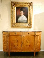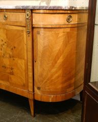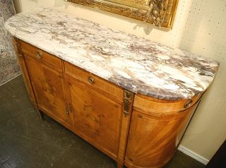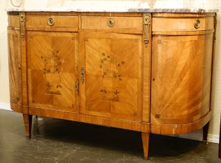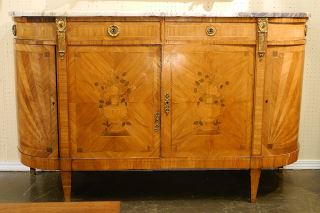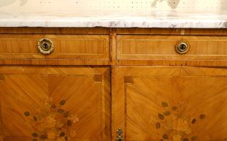 French Louis XVI Marquetry Sideboard with Marble Top, Veneer Loss Noted, 39 7/8" High.