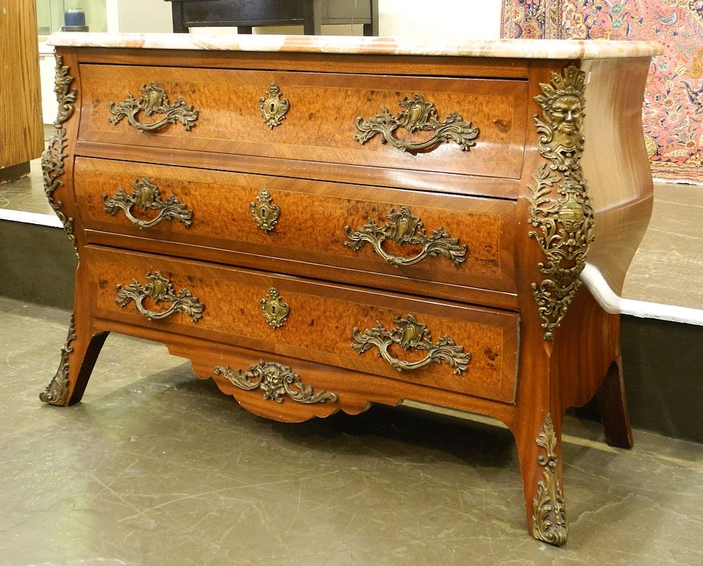 LOT 159 Louis XVI Style Mounted Ormolu Bombe Chest of Drawers with Marble Top, 36" x 52" x 20 3/4". Estimate: $500 - $800 Auction Date: Tuesday, December 12 2023 at 4:00 PM