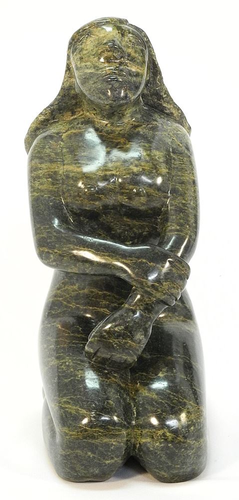 LOT 68 Unsigned Inuit Stone Sculpture, 15 x 6 x 8", "Kneeling Woman" with Label 9404646. Estimate: $300 - $400 Sold For: $550 Auction Date: Tuesday, December 12 2023 at 4:00 PM