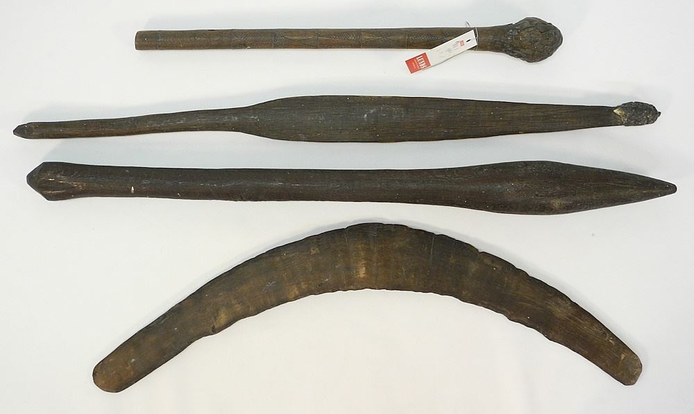 LOT 166 3 Australian Digging Sticks & Boomerang, 16 5/8 - 25 3/8"L, Collected 1890/91. Estimate: $300 - $500 Sold For: $750 Auction Date: Tuesday, December 12 2023 at 4:00 PM