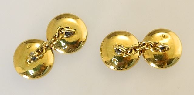 Pair of 18K (marked) Yellow Gold Mother of Pearl & Sapphire Cuff Links, 8.38 Grams.