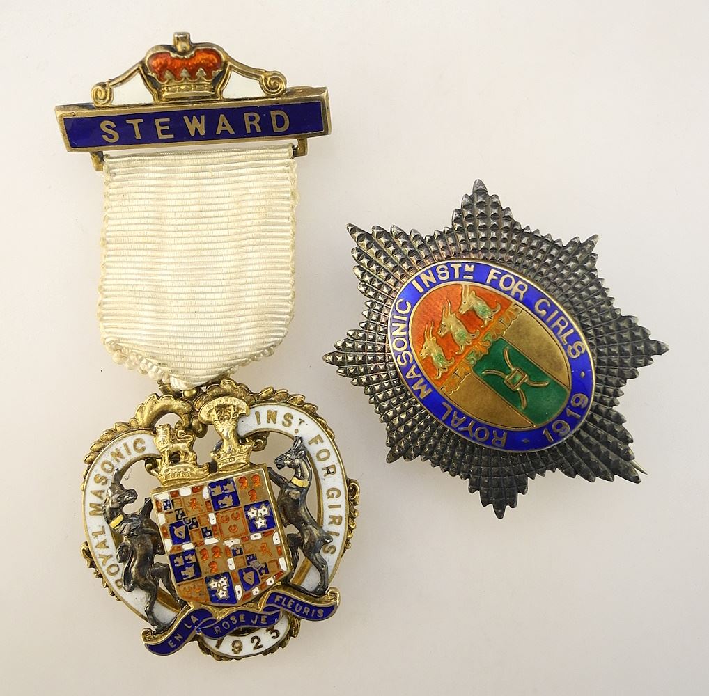 LOT 94 2 Enameled Silver Royal Masonic Institute for Girls Medals: 1923 & 1919, 3 1/8 & 1 7/8"H. Estimate: $100 - $200 Auction Date: Tuesday, December 12 2023 at 4:00 PM