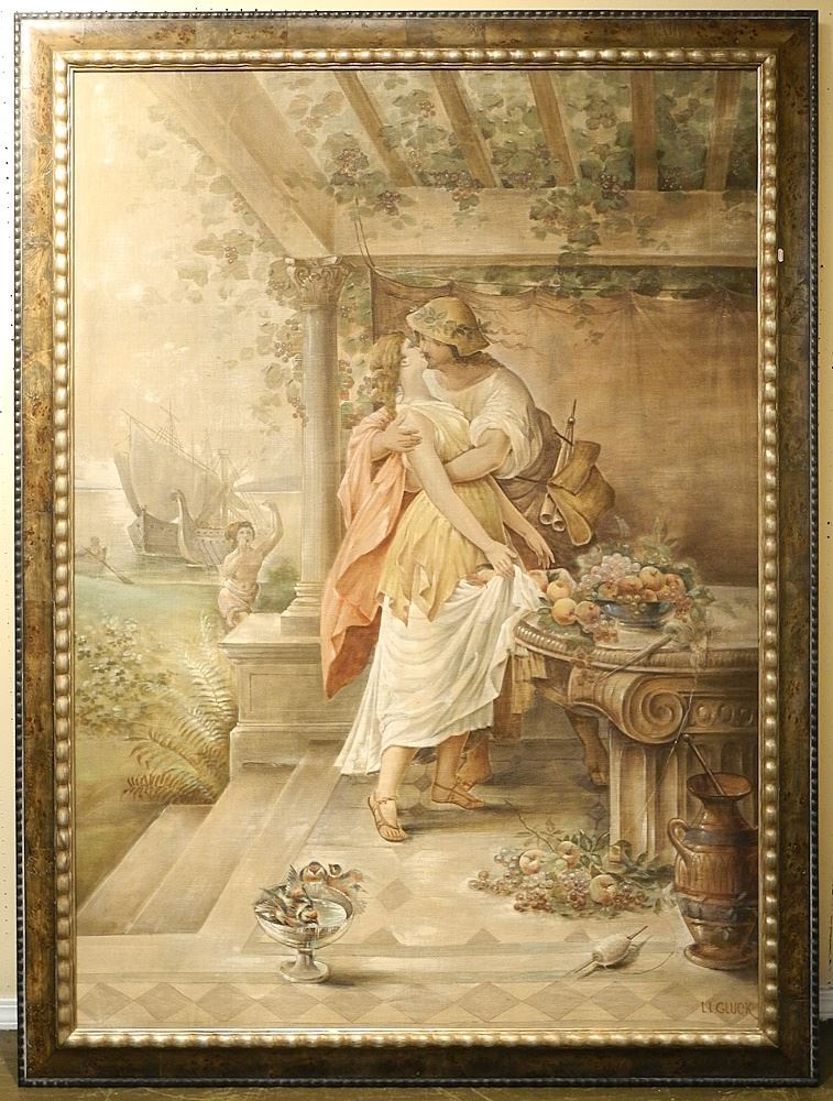 Oil on Textile signed L.L. Gluck, 63 1/2 x 45 3/8", Classical Encounter.
