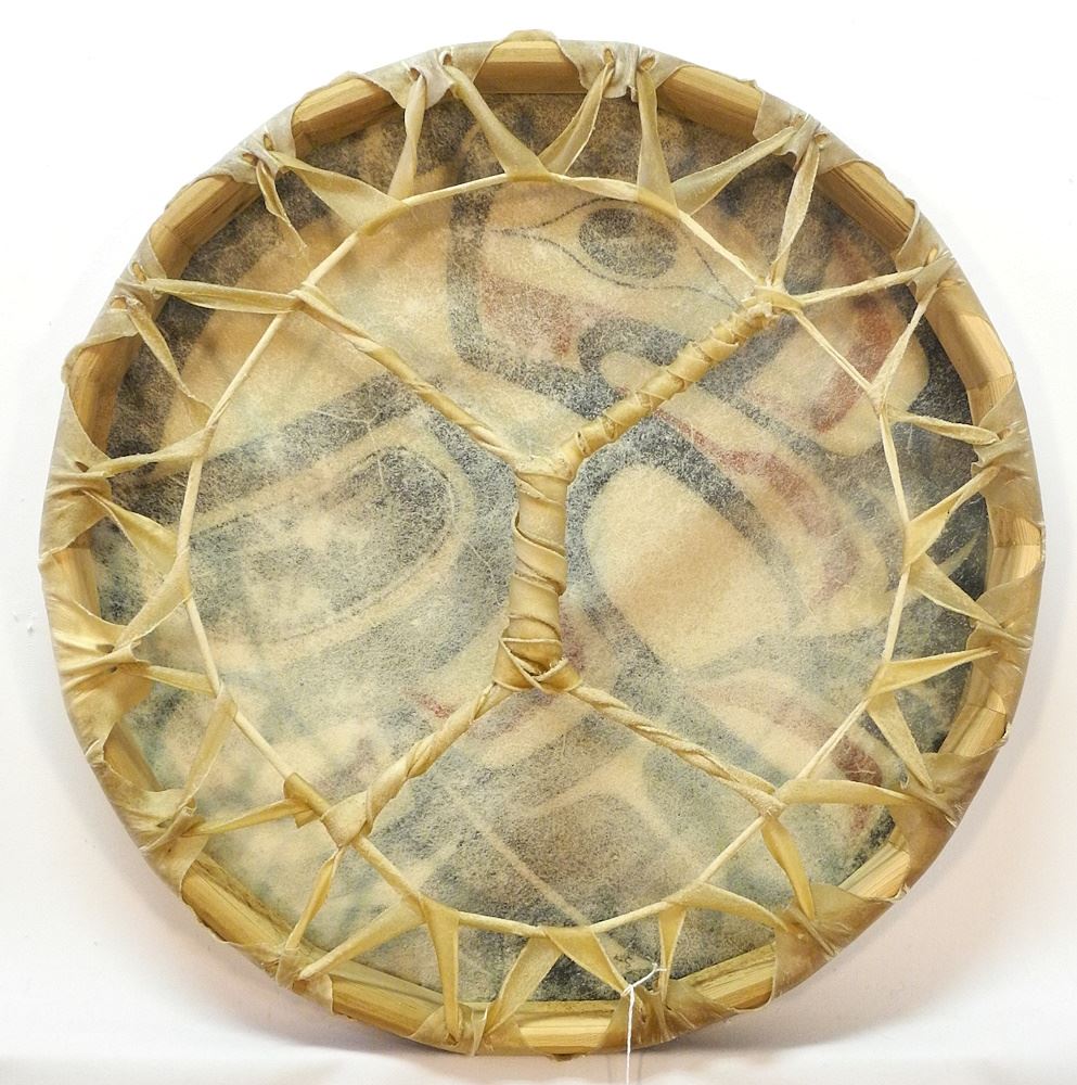 LOT 121 Northwest Coast Drum Monogrammed S. 2016, 20 1/2" Diameter x 2 7/8", "Raven Design". Estimate: $250 - $350 Sold For: $550 Auction Date: Tuesday, February 27 2024 at 4:00 PM