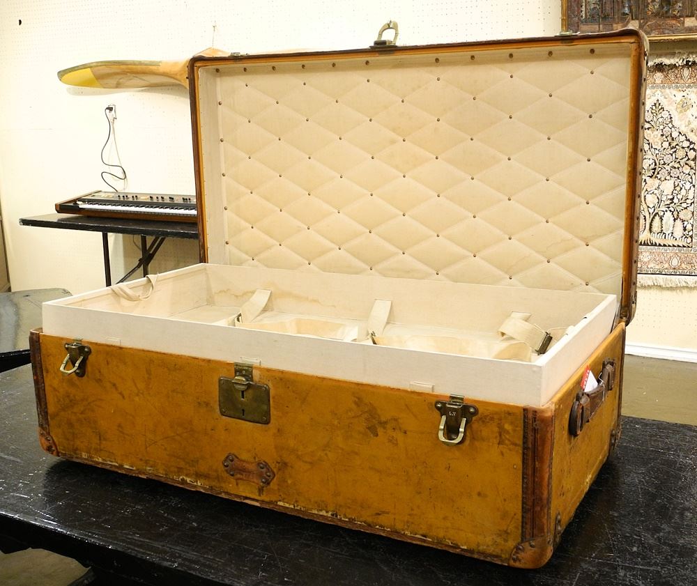 Louis Vuitton Steamer Trunk, Orange Vuittonite Canvas, C.1920, 13 x 39 3/4 x 21 7/8".