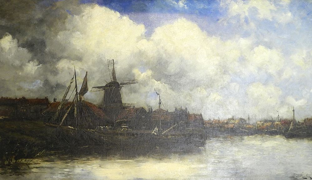 Oil on Canvas signed J. (Jan) Van Couver (Hermanus Koekkoek), 23 3/8" x 41", "Harbour Scene".