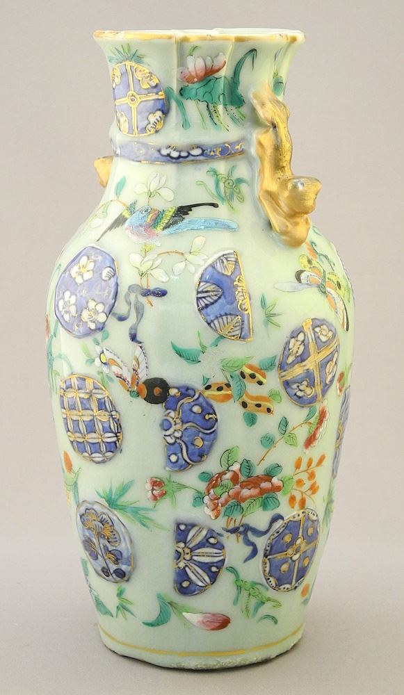 Chinese Turquoise Glaze Vase with Blue & White Features & Gathered Neck, 9 1/4"H (chip noted)