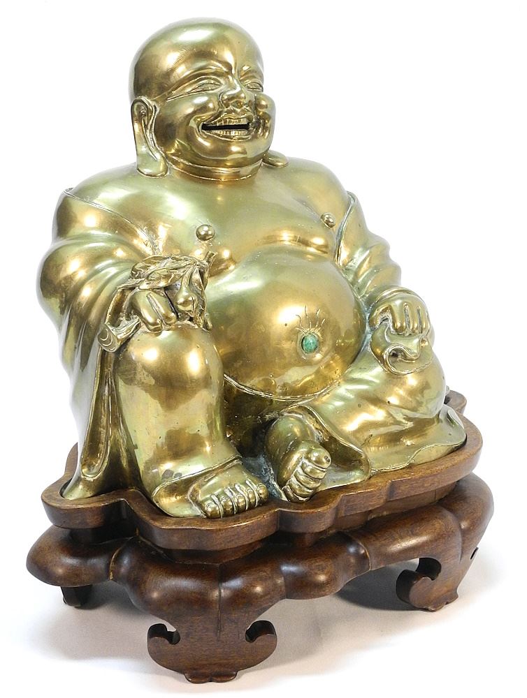 LOT 145 Chinese Brass Figure of the Buddha with Wood Base, TH 19 7/8" x 18" x 13 3/4". Estimate: $300 - $500 Sold For: $1,100 Auction Date: Tuesday, February 27 2024 at 4:00 PM