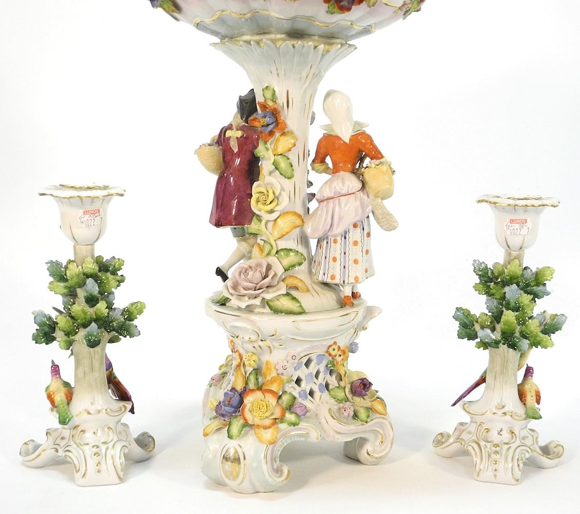 LOT 131 German Porcelain Center Piece and a Pair of Gold Anchor Mark Candlesticks. Estimate: $200 - $300 Sold For: $200 Auction Date: Tuesday, February 27 2024 at 4:00 PM