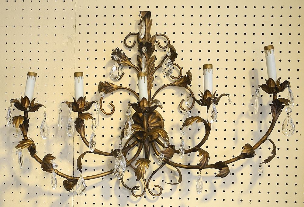 LOT 54 Pair of Spanish 5 Socket Crystal Droplet Wall Sconces, 20 1/2 x 28 x 6 1/2" Estimate: $250 - $350 Auction Date: Tuesday, February 27 2024 at 4:00 PM