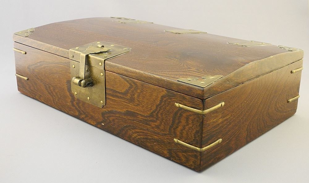 LOT 104 Asian Elm Brass Mounted Box, 4 1/8" x 14 1/2" x 9 1/4". Estimate: $100 - $200 Sold For: $130 Auction Date: Tuesday, February 27 2024 at 4:00 PM