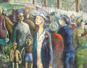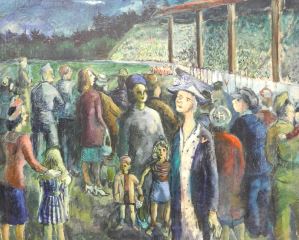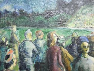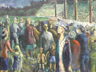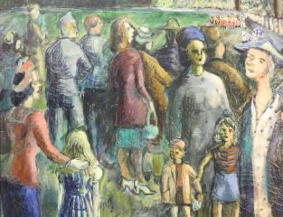 Oil on Canvas Attr. to Molly Lamb Bobak, 24" x 29 1/2", "C.1940 Rally at Brockton Pt.".
