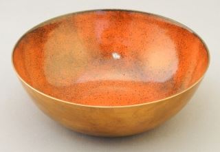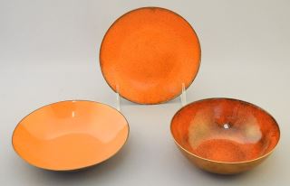3 Enameled Copper Dishes signed Jade Snow Wong, 5 1/8" - 5 5/8" Diam.