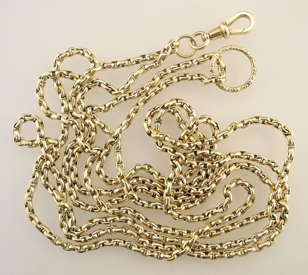 LOT 39 9c (tested) 60" Watch Chain. Estimate: $1,000 - $1,500 Sold For: $1,000 Auction Date: Tuesday, April 30 2024 at 4:00 PM