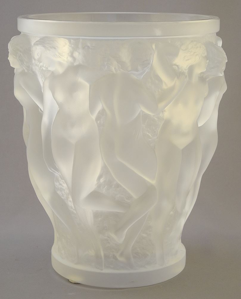 LOT 46 Lalique France "Bacchantes" Vase, 9 3/4"High, 6" vertical interior crack noted. Estimate: $300 - $400 Sold For: $250 Auction Date: Tuesday, April 30 2024 at 4:00 PM