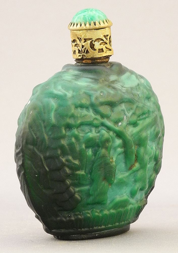 LOT 85 Malachite Glass Scent Flask, 2 3/4"h Estimate: $100 - $200 Auction Date: Tuesday, August 27 2024 at 4:00 PM