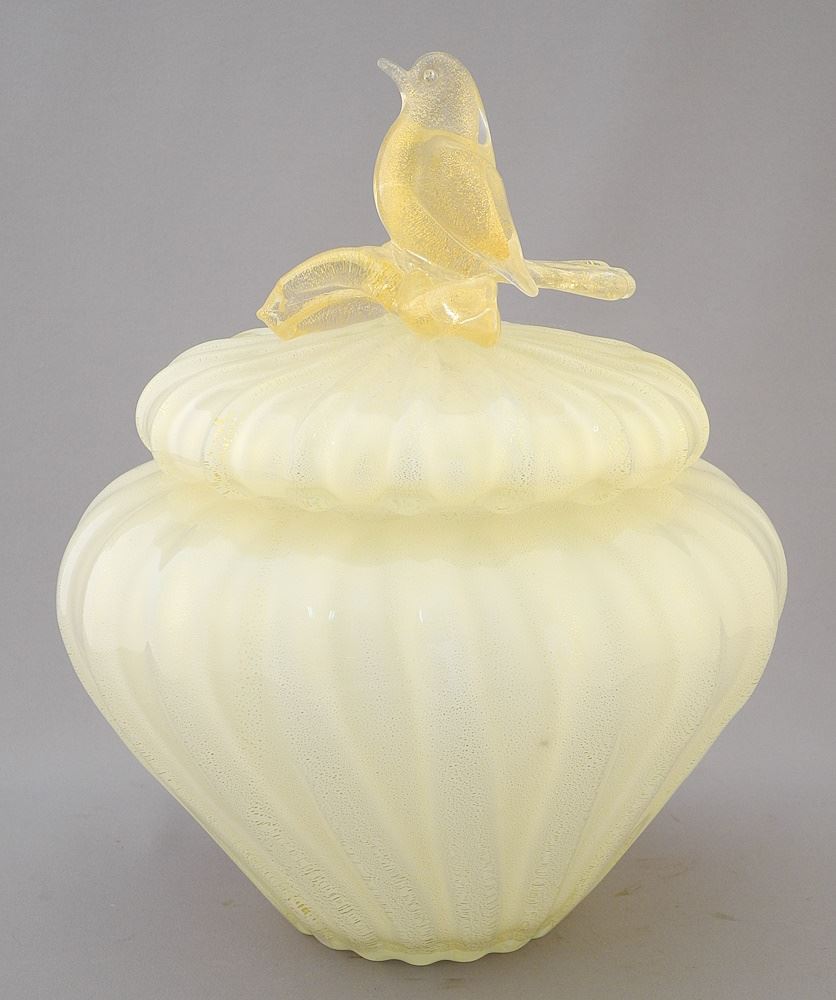 Barovier Murano Gold Fleck Covered Bowl with Bird Handle, 10" x 8".