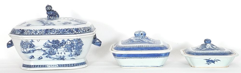 LOT 1 Three 19th C. Chinese Export Porcelain Blue & White Tureen & Covered Dishes, 7 1/2"-13" Estimate: $200 - $400 Sold For: $250 Auction Date: Tuesday, October 22 2024 at 4:00 PM