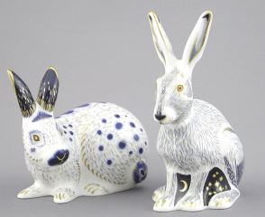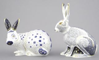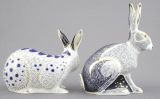 Royal Crown Derby "Starlite Hare" (5 1/2") & "English Rabbit Blue" Paperweights.