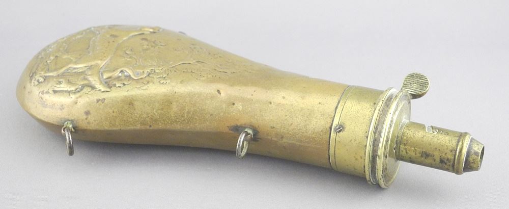 LOT 114 19th C. Janes Dixon & Sons Hound Motif Brass Powder Flask, 8"h. Estimate: $120 - $180 Sold For: $160 Auction Date: Tuesday, October 22 2024 at 4:00 PM