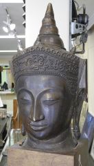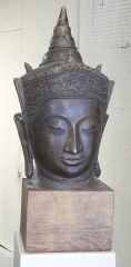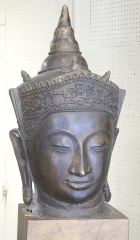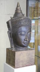 LOT 156 Copper Alloy Head of the Buddha (24" h) on Wood Stand, 30 3/4"h. Estimate: $300 - $500 Auction Date: Tuesday, October 22 2024 at 4:00 PM