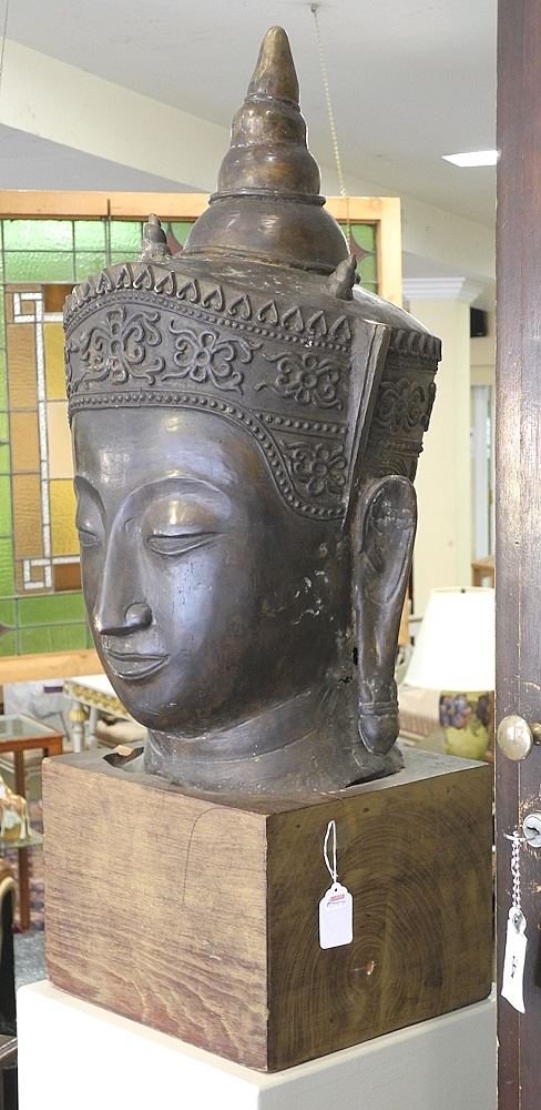 Copper Alloy Head of the Buddha (24" h) on Wood Stand, 30 3/4"h.