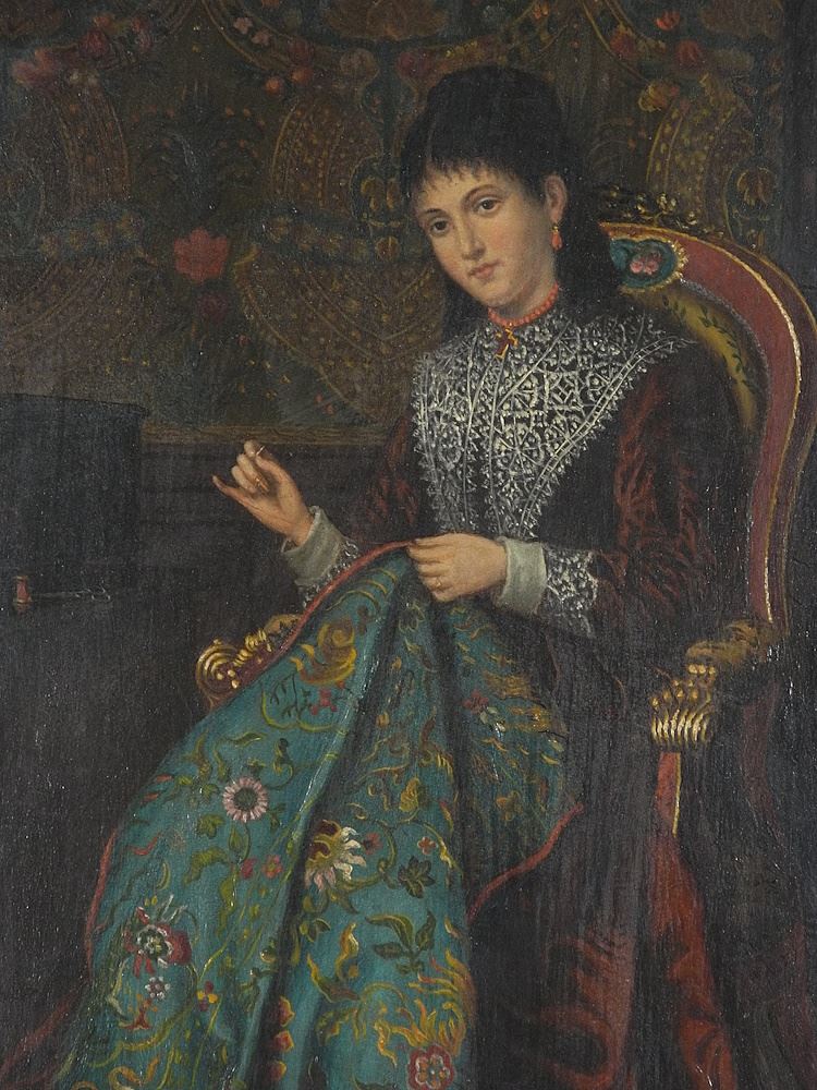 Oil on Panel Signed A. Stevens, 20 1/4" x 14 3/4", "Portrait of a Lady Sewing".