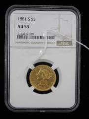 LOT 44 1881 USA $5 Gold Half Eagle Coin, Graded. Estimate: $700 - $900 Sold For: $800 Auction Date: Tuesday, December 10 2024 at 4:00 PM
