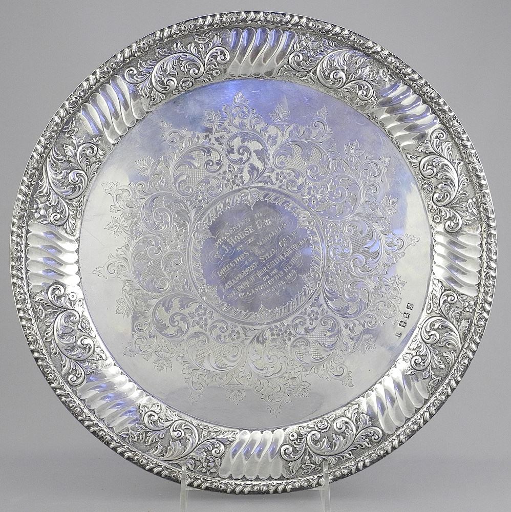 Hallmarked Silver Footed Tray, Inscribed, 12 5/8" Diameter, 884g, Glasgow.