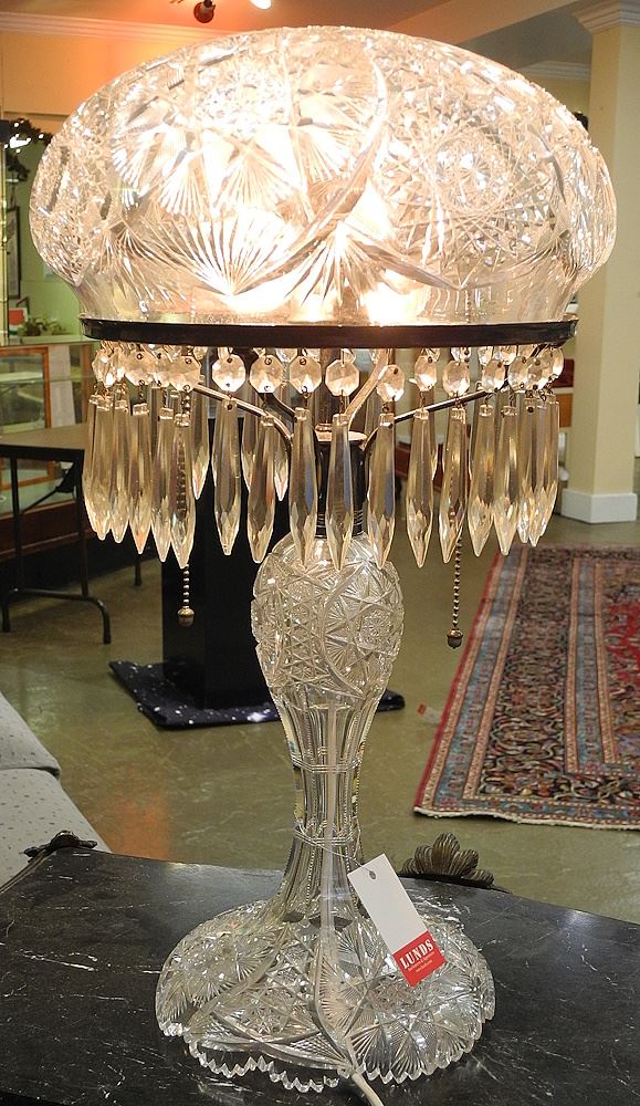 C. 1900 Brilliant Cut Crystal Domed Table Lamp with Droplet Rim, 21 1/2" h.
