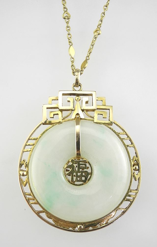 LOT 64 18K Chinese Natural Jadeite Pendant on 22K Chain, 19"L, 23.9g. Estimate: $1,600 - $1,800 Auction Date: Tuesday, December 10 2024 at 4:00 PM