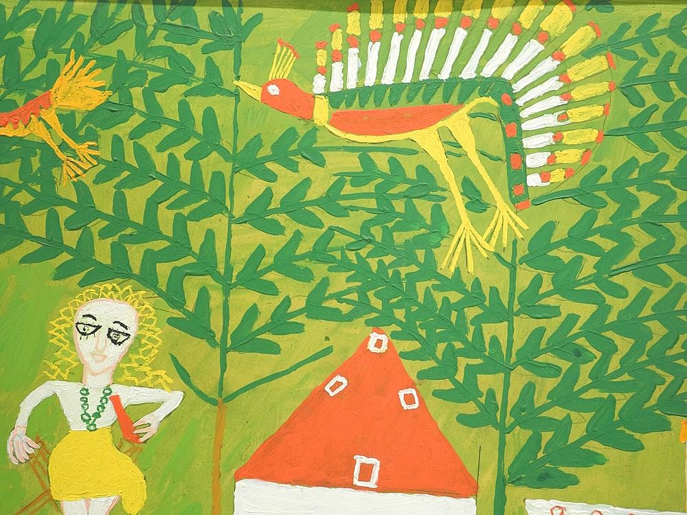 Mixed Media on Board signed Martin Saldana, 20" x 30", "Girl, Chair & Birds" C.1965.