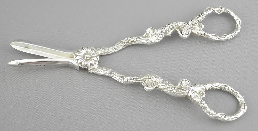 LOT 95 Pair of Victorian Hallmarked Silver Grape Shears, London 1818, 6 1/2"L, 93g. Estimate: $100 - $150 Sold For: $160 Auction Date: Tuesday, December 10 2024 at 4:00 PM