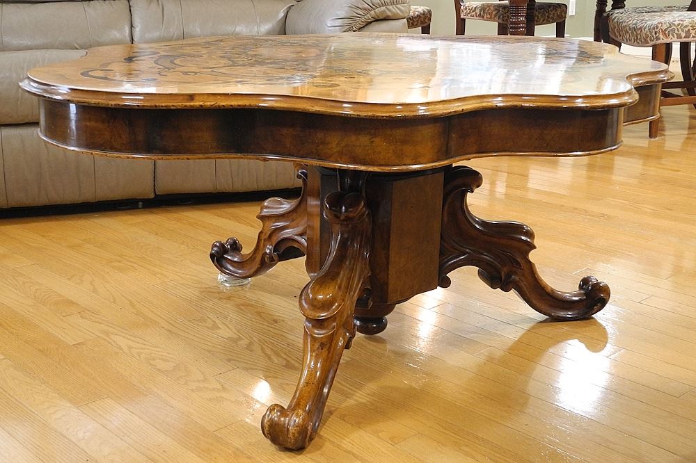 LOT 62 Victorian Elaborately Inlaid Walnut Shaped Top Coffee Table, 50 x 39 x 20 1/2". Estimate: $400 - $600 Sold For: $400 Auction Date: Tuesday, April 01 2025 at 4:00 PM