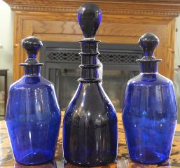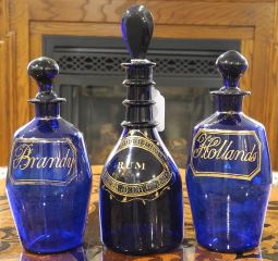 Three Bristol Blue Decanters; Brandy , Rum & Hollands, 9 3/4" Tallest.