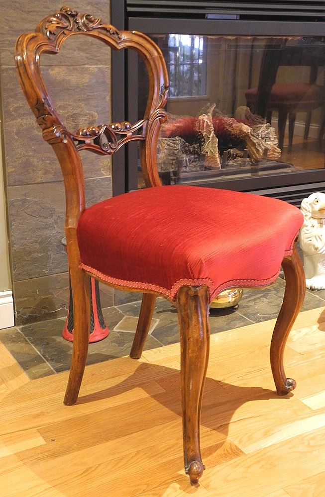 LOT 75 Two Victorian Carved Mahogany Cabriole Legside Chairs with Red Upholstery, 33 1/4 x 34 3/ Estimate: $100 - $150 Sold For: $100 Auction Date: Tuesday, April 01 2025 at 4:00 PM