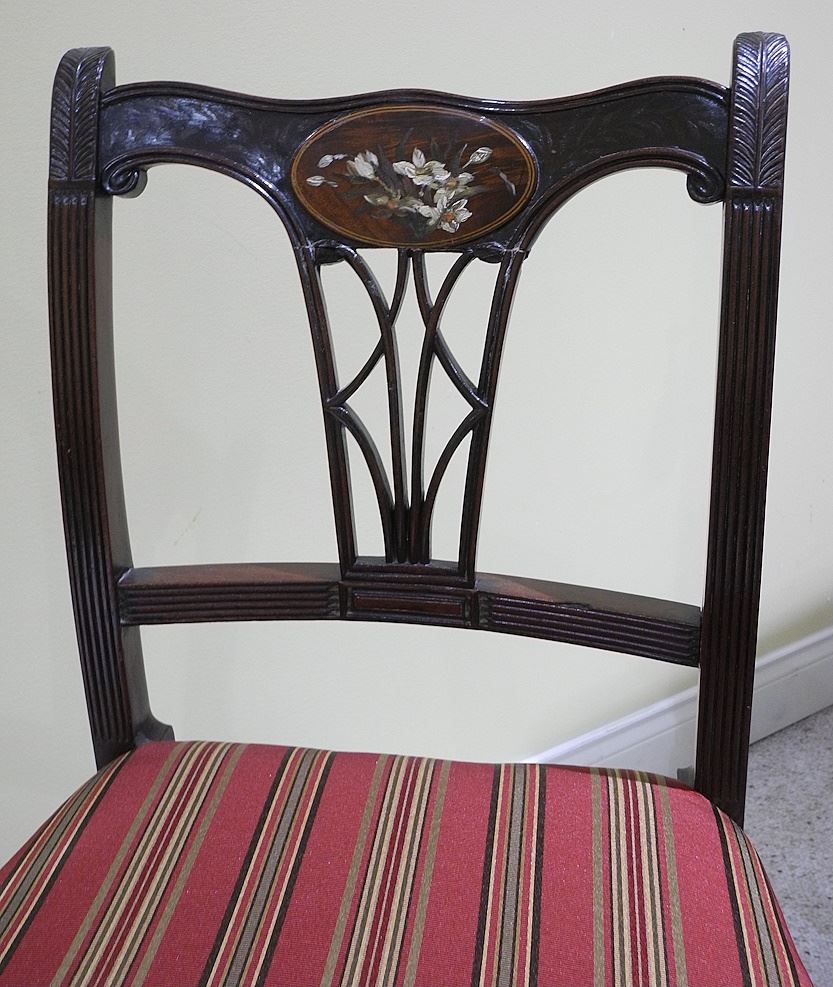 LOT 124 Sheraton Carved Mahogany Open Armchair & 2 Matching Side Chairs with Painted Panels, 32". Estimate: $200 - $300 Sold For: $300 Auction Date: Tuesday, April 01 2025 at 4:00 PM