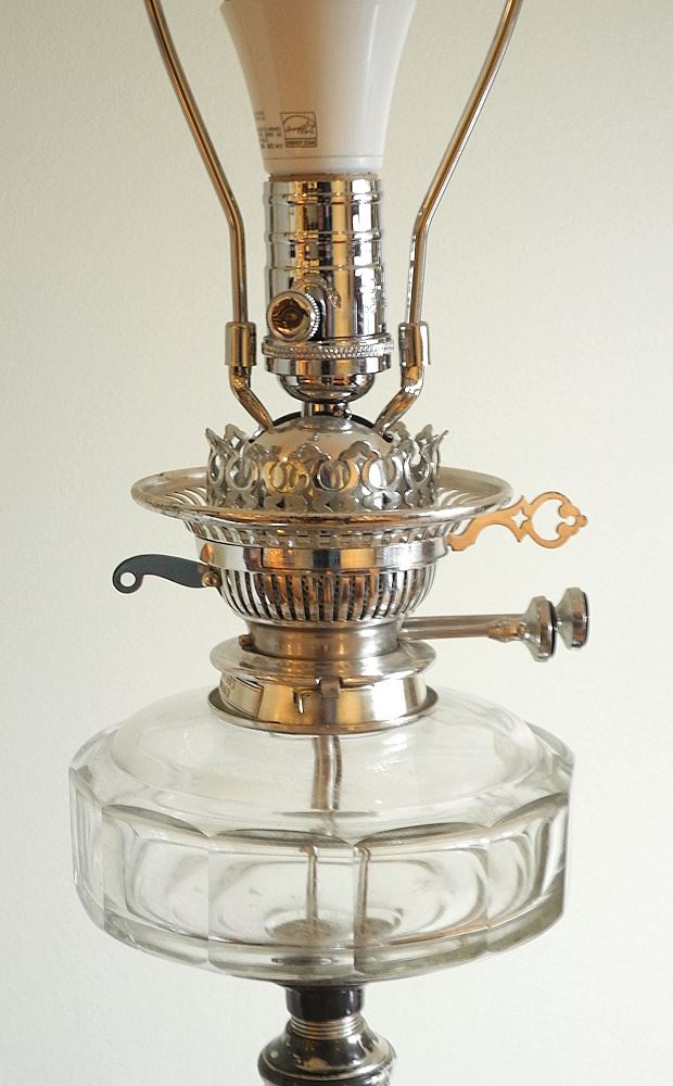 LOT 41 Silver Plated Oil Lamp Converted To Electricity, 30" With Shade Estimate: $150 - $250 Auction Date: Tuesday, April 01 2025 at 4:00 PM