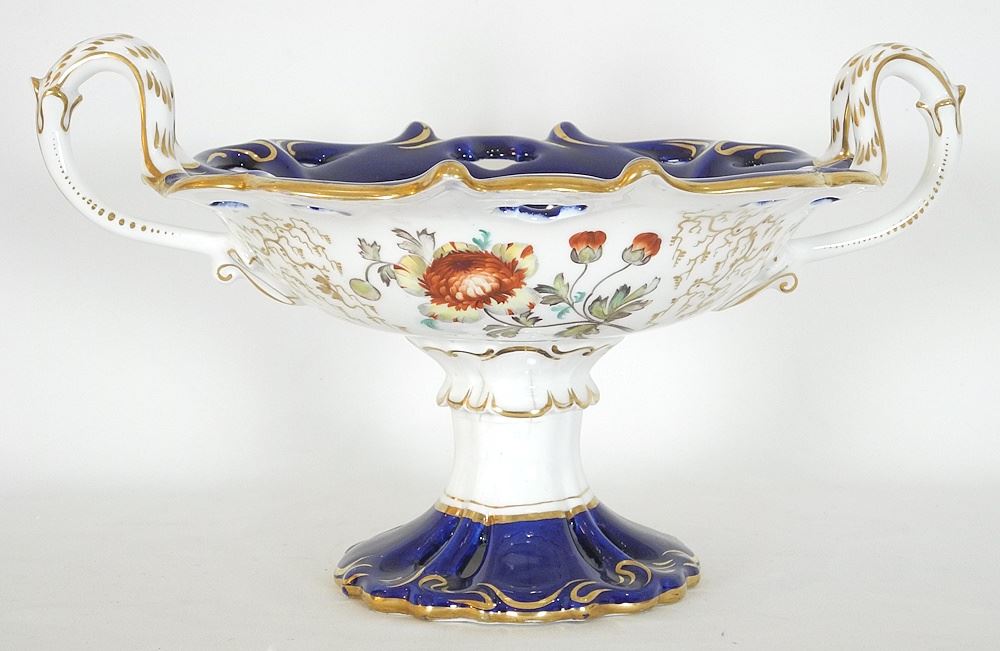 Mid 19th C. China Dessert Service Pattern 1821, Cobalt & Floral Compote, 8 1/4 x 14 1/2 x