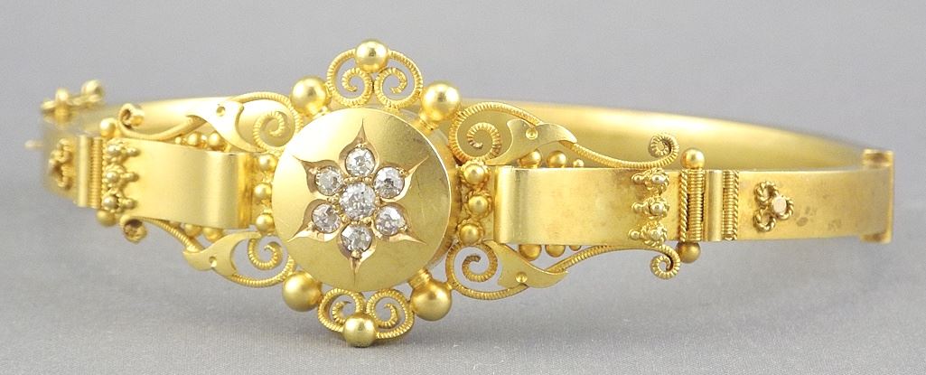 LOT 31 15ct (marked) Gold & Diamond Hinged Bracelet, 2 5/8"w, 15.9g with Box. Estimate: $1,000 - $1,500 Sold For: $1,300 Auction Date: Tuesday, April 01 2025 at 4:00 PM