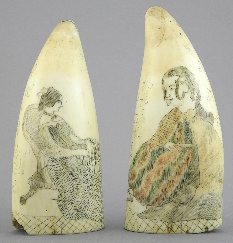 LOT 37 Two Scrimshaw Whale Teeth Depicting European Women, Tallest 5 3/4", NO EXPORT. Estimate: $300 - $500 Sold For: $1,200 Auction Date: Tuesday, April 01 2025 at 4:00 PM