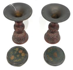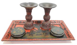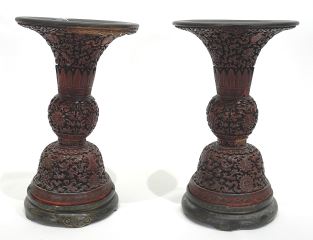 LOT 94 Pair of Cinnabar Lacquer Altar Vases (9 3/4"h) on Stands, Qianlong Mark, with Tray (condition noted Estimate: $200 - $400 Sold For: $10,000 Auction Date: Tuesday, June 17 2025 at 4:00 PM