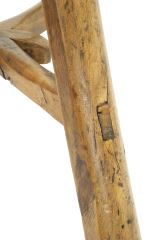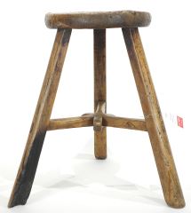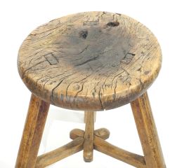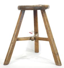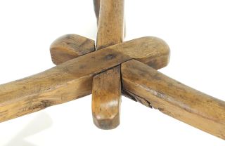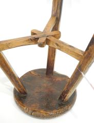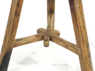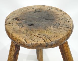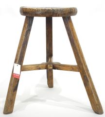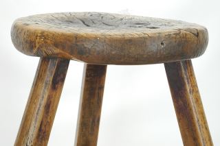 LOT 15 Primitive Elm Top Milking Stool, 20 1/4"h, Interesting Joinery Noted (one leg burnt). Estimate: $150 - $300 Sold For: $275 Auction Date: Tuesday, June 17 2025 at 4:00 PM