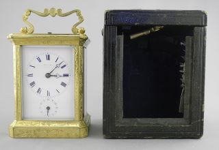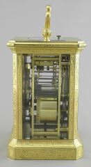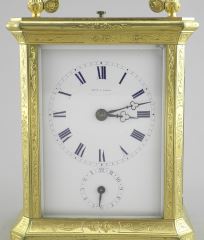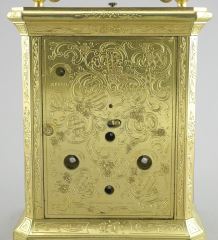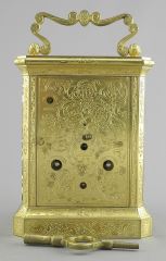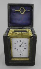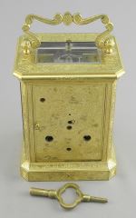 LOT 11 Dent Paris Engraved Brass Semi Repeater Carriage Clock with Alarm, 4 1/16"h, with Key. Estimate: $500 - $1,000 Sold For: $1,300 Auction Date: Tuesday, August 19 2025 at 4:00 PM