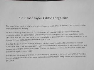 LOT 143 Repeating Long Case Clock signed John Taylor Ashton 1735, 93 1/2"h. Estimate: $600 - $1,000 Sold For: $3,500 Auction Date: Tuesday, August 19 2025 at 4:00 PM