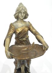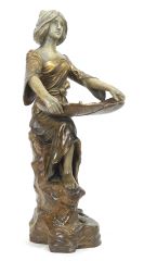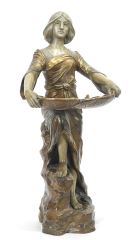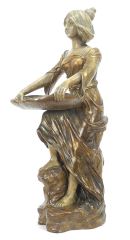LOT 136 Art Nouveau Cast Ceramic Figure of a Maiden Clutching a Lily Dish, 25 7/8 "h. Estimate: $300 - $500 Sold For: $275 Auction Date: Tuesday, August 19 2025 at 4:00 PM