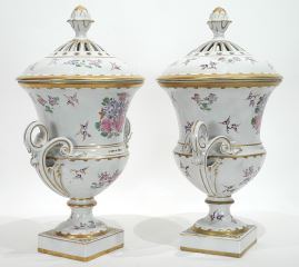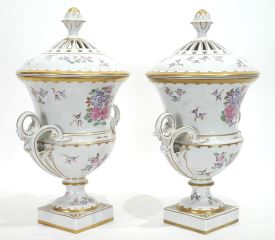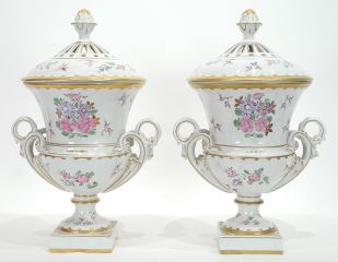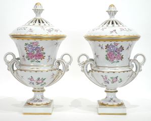 LOT 174 Pair of Dresden Porcelain Covered Urns, 14 1/2"h. Estimate: $200 - $400 Sold For: $200 Auction Date: Tuesday, August 19 2025 at 4:00 PM